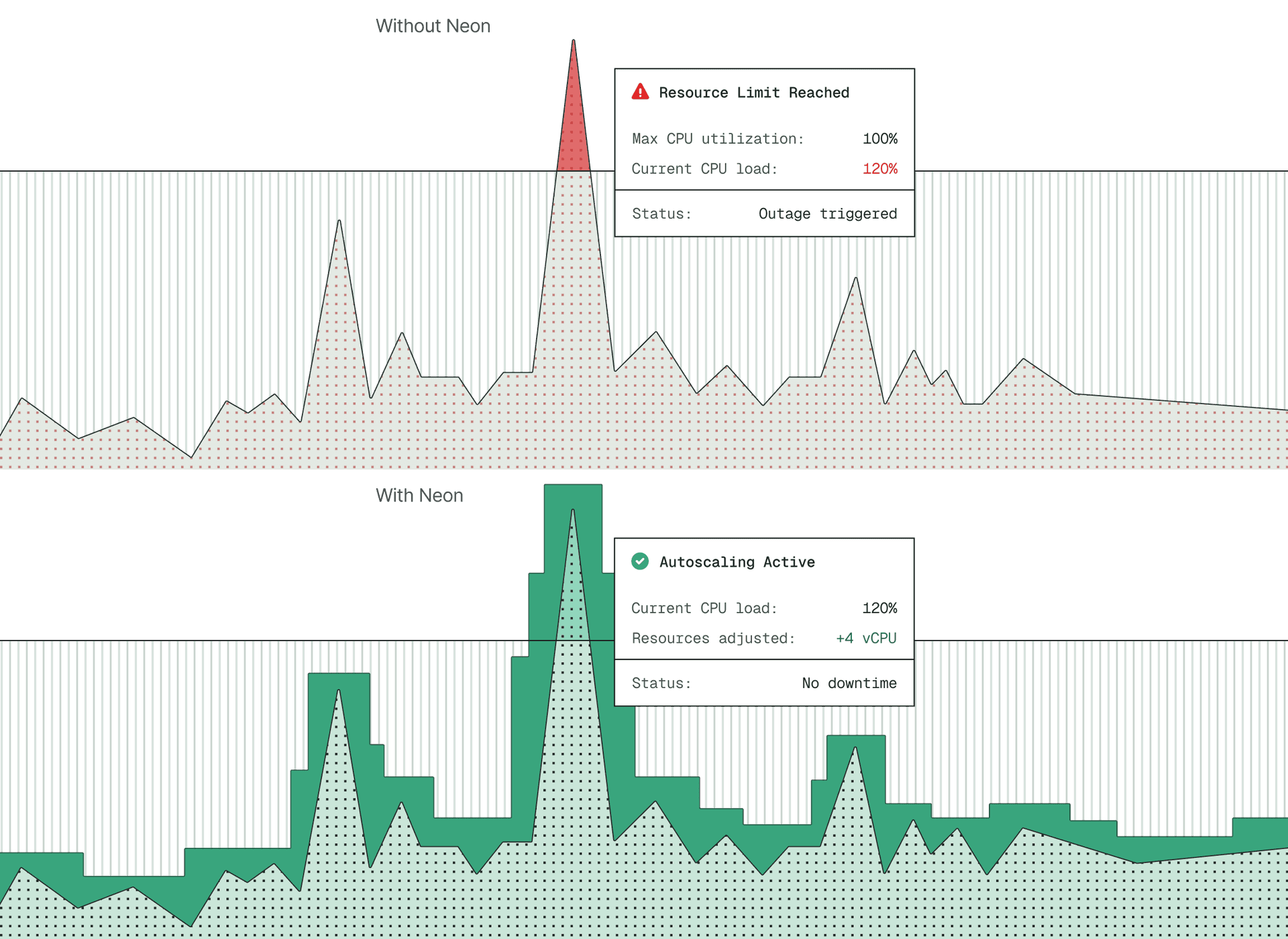 Neon monitors your database load ten times a second and autoscales CPU and memory to exactly fit your workload.